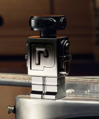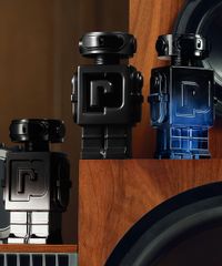 • Frasco icônico em formato de robô com acabamento cromado e preto, um objeto de design que reflete a modernidade da fragrância.