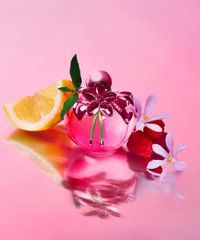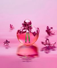 • Frasco icônico em formato de maçã, reinventado em um tom rosa metálico e vibrante.