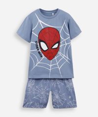 Conjunto de pijama infantil confeccionado em malha de algodão com estampa temática do Homem-Aranha. Composto por camiseta e short. A camiseta tem modelagem reta, caimento solto ao corpo, mangas curtas e gola redonda. O short tem modelagem reta, caimento solto ao corpo, cós com elástico embutido e acabamento pespontado nas barras.