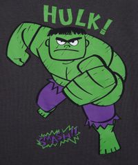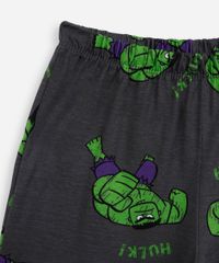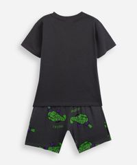 Conjunto de pijama infantil confeccionado em malha de algodão com estampa temática do Hulk. Composto por camiseta com modelagem reta, caimento solto, gola redonda e mangas curtas. E short de modelagem reta, caimento solto, cós elástico e pesponto nas barras.