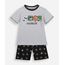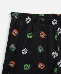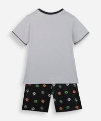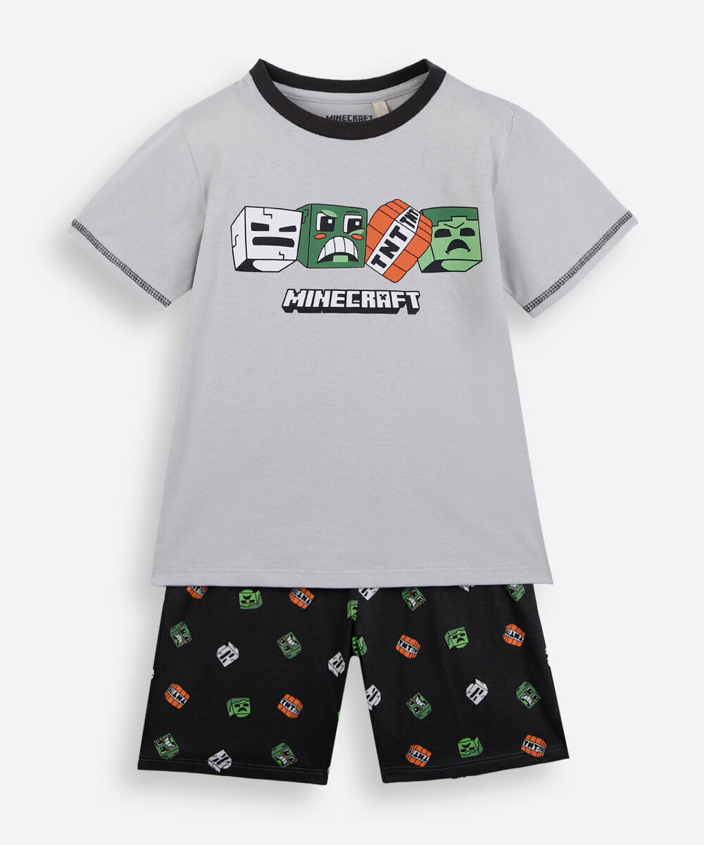 Pijama infantil confeccionado em malha de algodão com toque leve e macio. Composto por camiseta e bermuda. A camiseta possui decote redondo canelado e mangas curtas. A bermuda possui cós com elástico embutido. Ambas as peças possuem estampa dos personagens de Minecraft em cores contrastantes, modelagem reto e caimento solto, acabamentos canelado e pespontado.