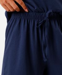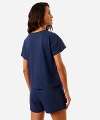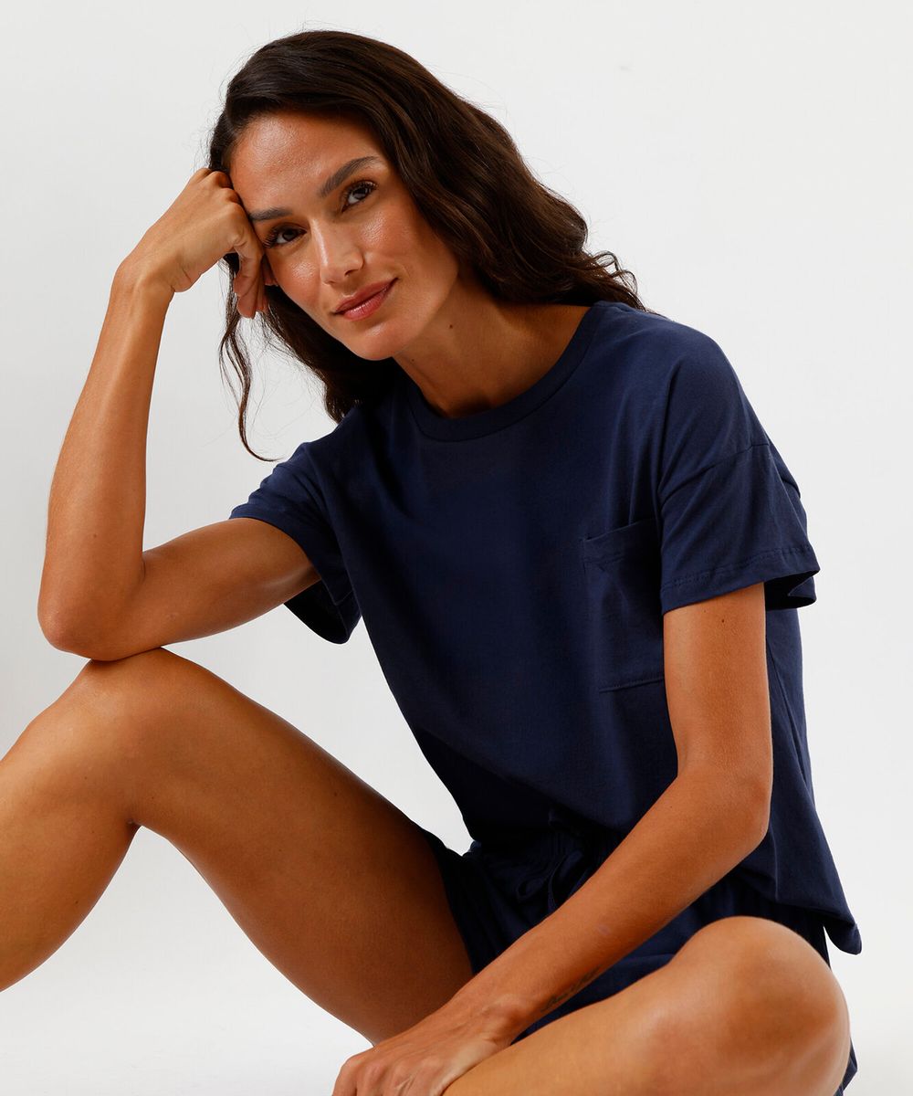 Pijama short doll confeccionado em malha macia de algodão. A blusa possui decote redondo canelado, mangas curtas, caimento solto, um bolso aplicado na parte frontal e acabamento pespontado. O short possui cós elástico com detalhe de tiras aplicadas para amarração, caimento reto e solto e acabamento pespontado.