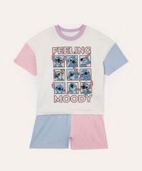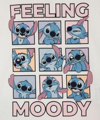 • Blusa de manga curta com gola redonda e uma divertida estampa frontal do personagem Stitch com a frase 'Feeling Moody'.