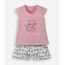 Pijama infantil composto por duas peças confeccionadas em algodão. Blusa com modelagem reta, caimento solto e confortável, gola redonda com aplicações decorativas, mangas curtas em frufru, estampa frontal com motivos de gato e acabamento pespontado. Short com modelagem reta, cintura média, cós com elástico embutido, barra com babado em frufru e estampa divertidas com motivos de gatos coloridos.