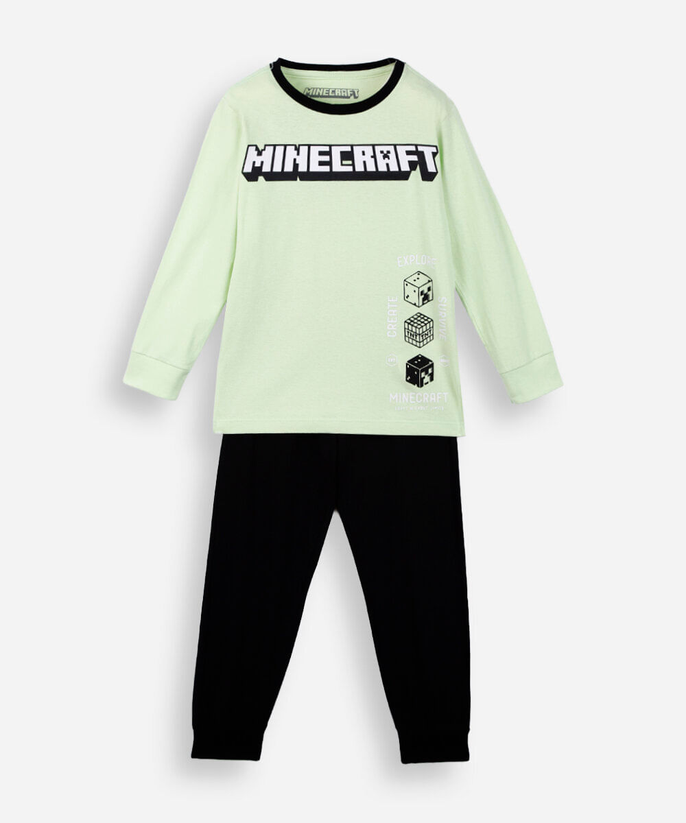 Pijama infantil composto por duas peças confeccionadas em algodão de toque macio. Blusa com modelagem reta, caimento solto e confortável, mangas longas, estampa temática do Mincraft e acabamento pespontado. Calça com modelagem jogger, caimento solto, cintura média e cós com elástico embutido.