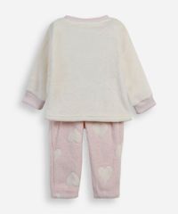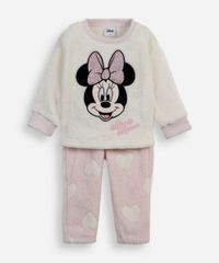 Pijama infantil composto por duas peças confeccionadas em tecido de pelúcia com bordado da personagem "Minnie". A blusa possui gola redonda canelada, mangas longas com punhos canelados, caimento reto e acabamento pespontado. A calça possui modelo jogger com estampa de coração, cintura alta, cós elástico, caimento solto e confortável ao corpo e acabamento pespontado. Composição: 100% poliéster Instruções de lavagem: - Lavar à mão - Proibido o alvejamento - Não secar em tambor - Secagem em varal à sombra - Passar à temperatura média - Limpeza à úmido, processo normal