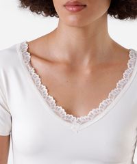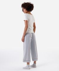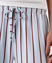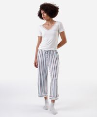 Conjunto de pijama feminino confeccionado em malha. Composto por blusa com modelagem reta, caimento levemente solto, decote v com renda aplicada e mangas curtas. E calça com modelagem pantacourt, estampa listrada, cós com elástico embutido, cordão ajustável e recorte nas barras.