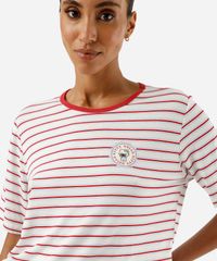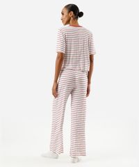 Conjunto de pijama feminino confeccionado em malha de viscose com padronagem listrada e estampa localizada da Hello Kitty. Composto por camiseta com modelagem reta, caimento solto ao corpo, decote redondo e mangas curtas. E calça com modelagem reta, caimento solto e cós com elástico embutido.