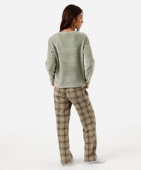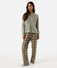 Pijama longo feminino confeccionado em malha fleece com toque macio e bordado temático Snoopy. Composto por blusa com modelagem reta, caimento solto ao corpo, gola redonda e mangas longas. E calça com modelagem reta, estampa xadrez, caimento solto e cós com elástico embutido.