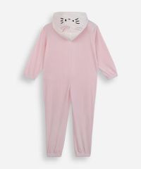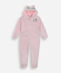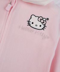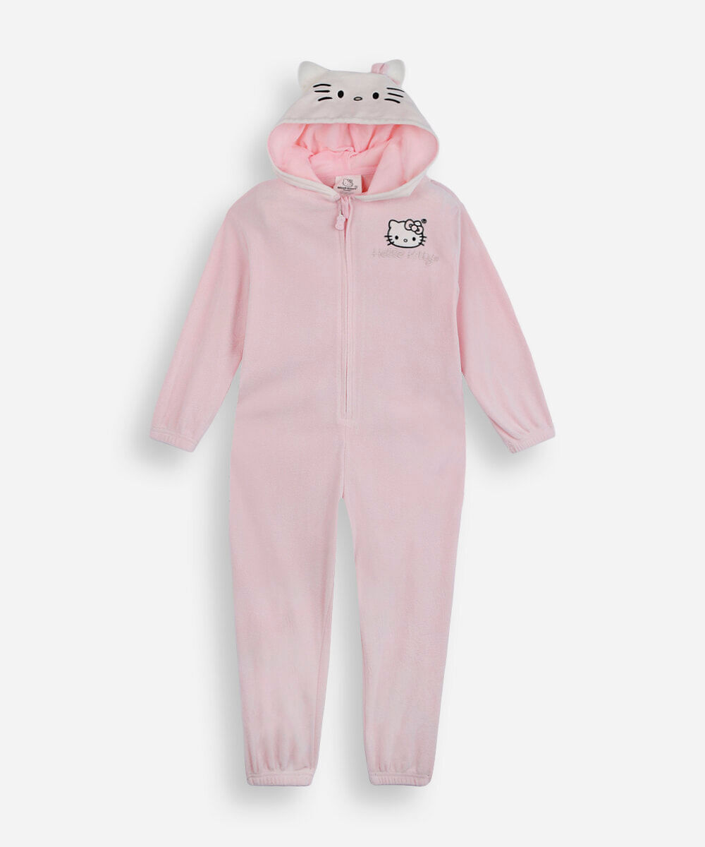 Pijama infantil confeccionado em plush com toque macio. A peça possui modelo com comprimento longo e caimento levemente solto proporcionando um maior conforto durante as atividades do bebê, decote redondo, capuz com detalhe em 3D, mangas longas, fechamento frontal por zíper com puxador, estampa bordada com desenho da personagem Hello Kitty em cores contrastantes, acabamento com elásticos embutidos e em pesponto.