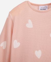 • Estampa corrida de corações, que adiciona um toque lúdico e charmoso ao conjunto infantil.