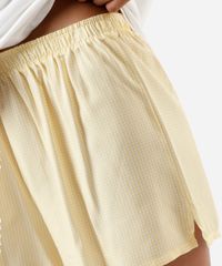 • Short com charmosa estampa xadrez vichy, modelagem reta e cós com elástico embutido para um ajuste perfeito.