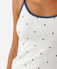 Conjunto de pijama short doll confeccionado em malha de algodão com estampa poá. Composto por regata e short. Sendo a regata com modelagem reta, caimento ajustado, com decote redondo e alças finas. E short com modelagem reta, caimento solto, botões decorativos e cós com elástico embutido. Detalhe de acabamento pespontado nas barras.