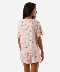 Conjunto de pijama short doll confeccionado em malha com estampa temática da Hello Kitty. Composto por camiseta e short. Sendo a camiseta com modelagem reta, caimento solto, com gola redonda e mangas curtas. E short com modelagem reta, caimento solto e cós com elástico embutido. Detalhe de acabamento pespontado nas barras.