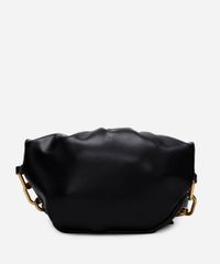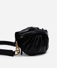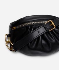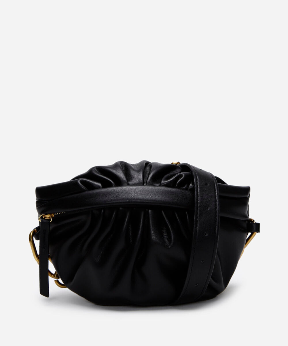 Pochete de carnaval desenvolvida em material sintético resistente. O modelo tem formato meia lua, com franzidos centralizado e fechamento por zíper. Possui forro, alça com corrente e fivela com níveis de ajuste.
