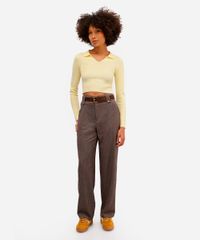 Polo feminina confeccionada em tricot leve com viscose e poliamida. A peça tem a modelagem e construção reta e o caimento é confortavelmente ajustado ao corpo. O modelo tem gola esporte, decote v e mangas longas.