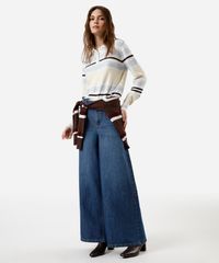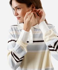 Polo feminina confeccionada em tricot leve com viscose e padronagem listrada. A peça tem a modelagem e construção reta e o caimento é confortavelmente solto ao corpo. O modelo tem gola esporte, fechamento por botões em vista e mangas longas. Detalhe de acabamento canelado na barra e punhos.