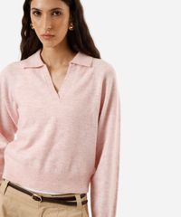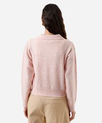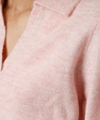 Polo feminina confeccionada em tricot leve. A peça tem a modelagem e construção reta e o caimento é confortavelmente solto ao corpo. O modelo tem gola esporte, decote V e mangas longas. Detalhe de acabamento canelado nos punhos e na barra.