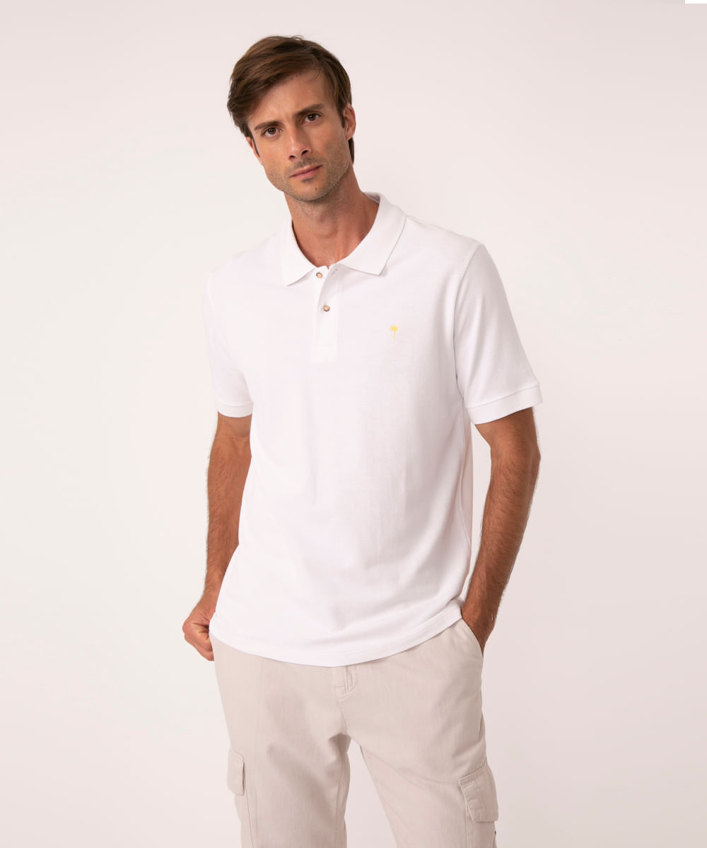 Polo confeccionada em malha piquet de algodão. O modelo tem caimento solto e confortável, mangas curtas e gola esporte. O fechamento é por vista com botões. Possui bordado frontal.