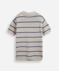 Polo infantil confeccionada em tricot de algodão com tramas sobressalentes proporcionando textura de listras na horizontal. Possui modelagem reta, gola clássica, vista com recorte em V, mangas curtas, barra com micro fendas laterais, listras horizontais em cor contrastantes e extremidades com toque canelado.