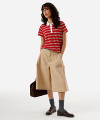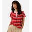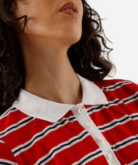 Polo feminina confeccionada em malha com algodão com estampa listrada. A peça tem a modelagem e construção reta e o caimento é confortavelmente solto ao corpo. O modelo tem gola esporte aplicada, fechamento frontal por botões em vista e mangas curtas. Detalhe de acabamento pespontado na barra e punhos.