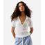 Polo feminina confeccionada em tricot com tramas espaçadas. A peça tem a modelagem e construção reta e o caimento é confortavelmente solto ao corpo. O modelo tem gola esporte aplicada, fechamento frontal por botões em vista e mangas curtas. Detalhe de acabamento em tom contrastante, nos punhos, gola e na barra.