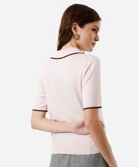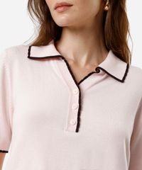 Polo feminina confeccionada em tricot leve de viscose e poliamida. A peça tem a modelagem e construção reta e o caimento é confortavelmente solto ao corpo. O modelo tem gola esporte aplicada, fechamento por botões em vista e mangas curtas. Detalhe de acabamento canelado e contrastante na barra, punhos e gola.