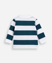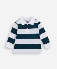 Polo infantil confeccionada em malha macia de algodão com estampa listrada. A peça tem a modelagem reta e o caimento é confortavelmente solto ao corpo. O modelo tem gola esporte, fechamento por botões em vista interrompida e as mangas são longas com acabamento pespontado nos punhos e na barra.