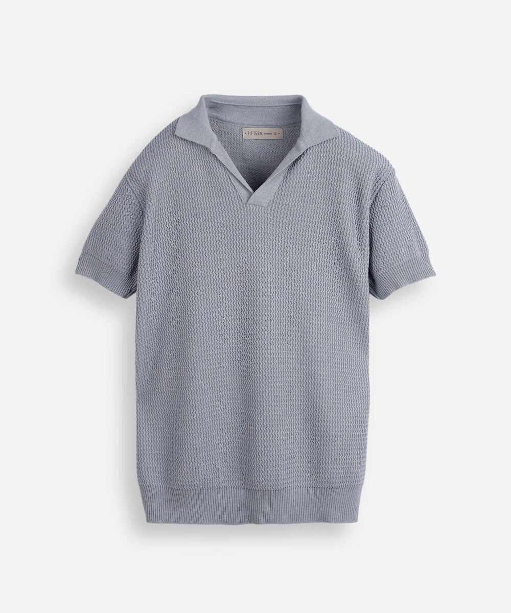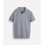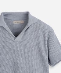 Polo juvenil confeccionada em tricot com toque texturizado. Possui modelagem reta, gola clássica, vista em V, mangas curtas, barra e punhos com efeito canelado.