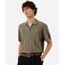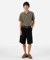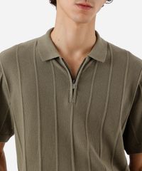 Polo masculina confeccionada em tricot de algodão com textura canelada. A peça tem a modelagem e construção reta e o caimento é solto ao corpo. O modelo tem gola esporte, fechamento por zíper parcial e mangas curtas. Detalhe de acabamento canelado na barra e punhos.