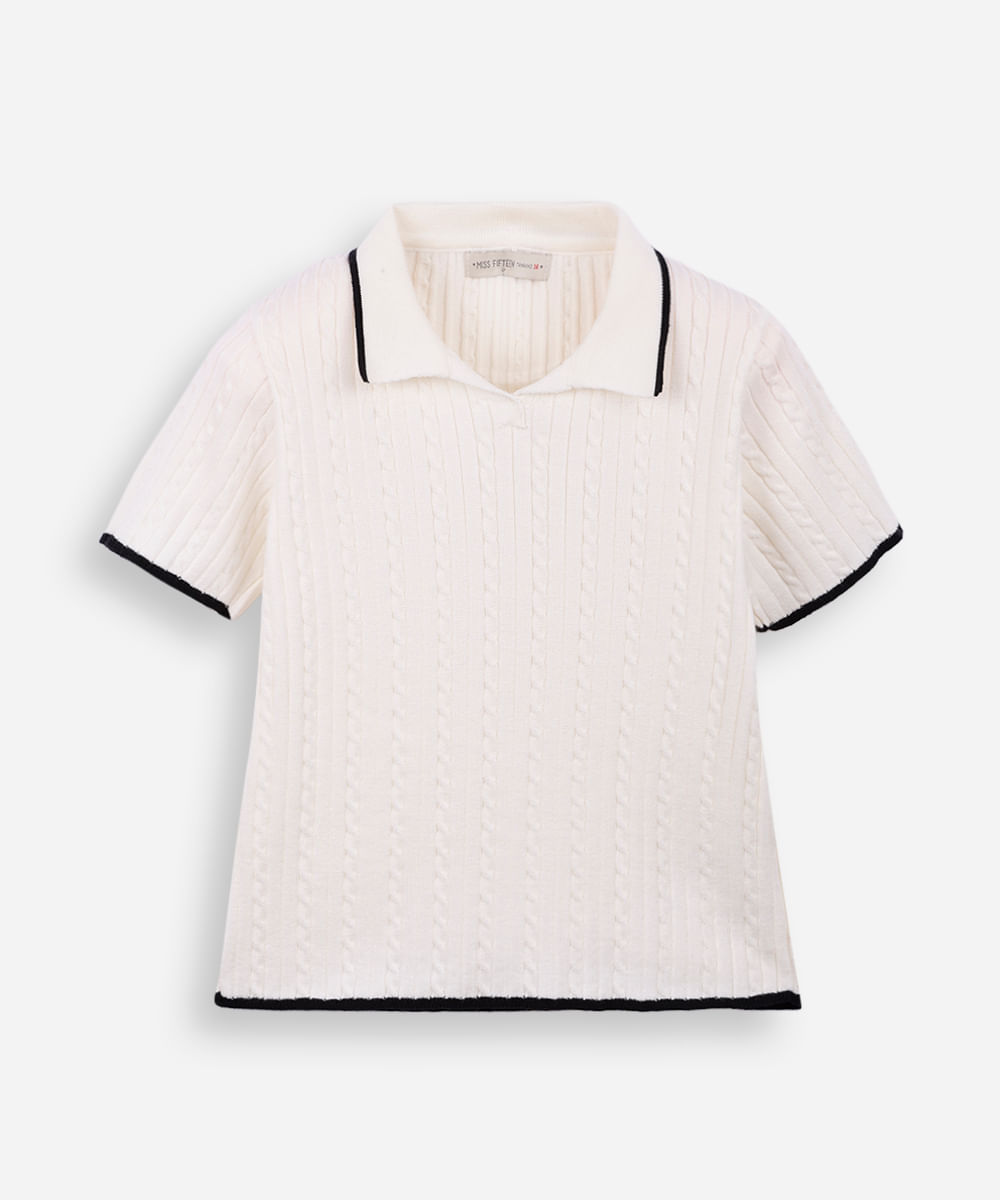 Camisa polo juvenil confeccionada em tricô com toque texturizado. Possui modelagem reta, gola clássica, decote V, mangas curtas e detalhes em tom contrastante.