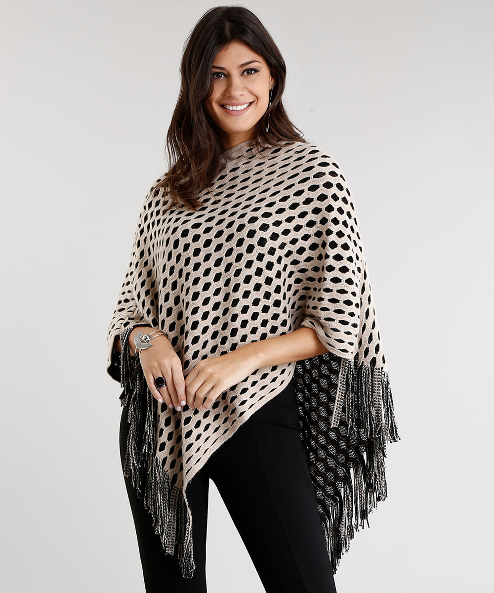 Poncho feminino desenvolvido em tricô macio. O modelo possui efeito geométrico formado pela trama. O decote é canoa. Não possui fechamento.