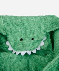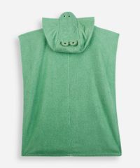 Poncho infantil confeccionado em malha felpada. A peça tem modelagem reta e caimento solto ao corpo. O modelo tem capuz fixo estilizado de jacaré com aplicações 3D. O acabamento é pespontado em todo o contorno.