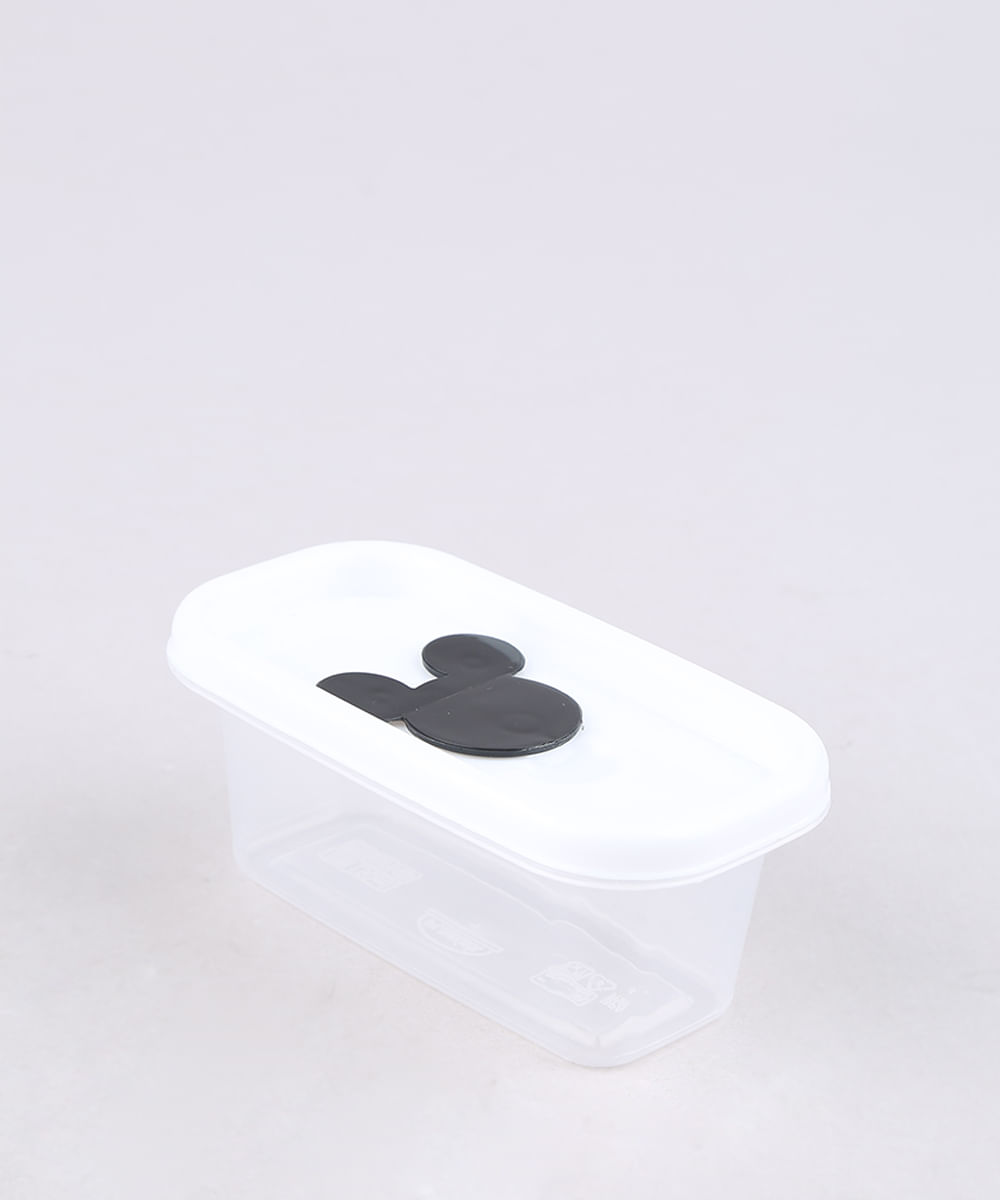 Pote desenvolvido em plástico com formato retangular. A tampa tem válvula com abertura no formato do Mickey. O fechamento é por encaixe. É livre de BPA. Medidas do Pote: Altura: 5 cm | Largura: 9 cm | Capacidade: 150 ml