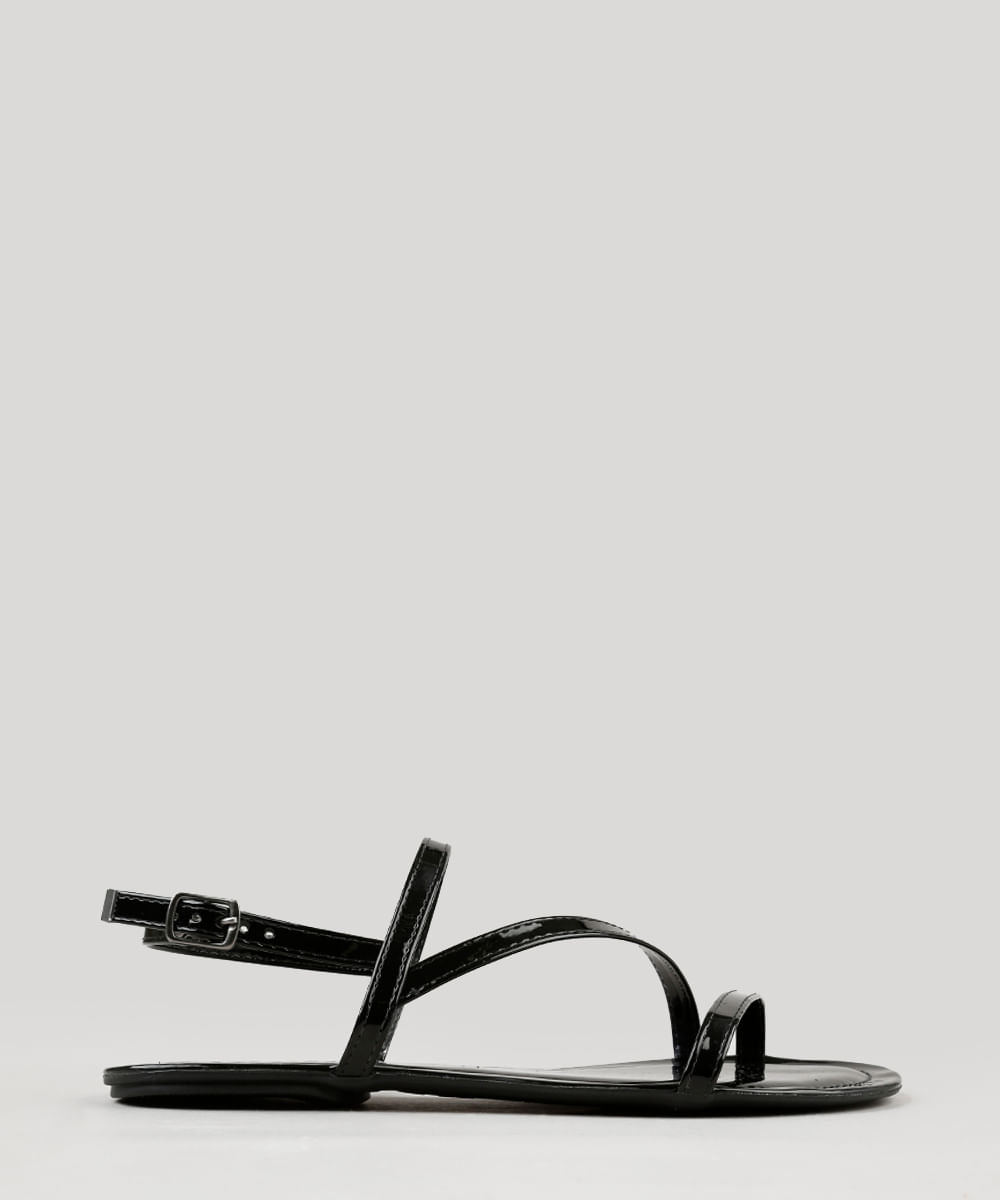 Rasteirinha feminina confeccionada em material com aspecto envernizado. O modelo tem cabedal feito com tiras finas. O fechamento é feito por fivela.