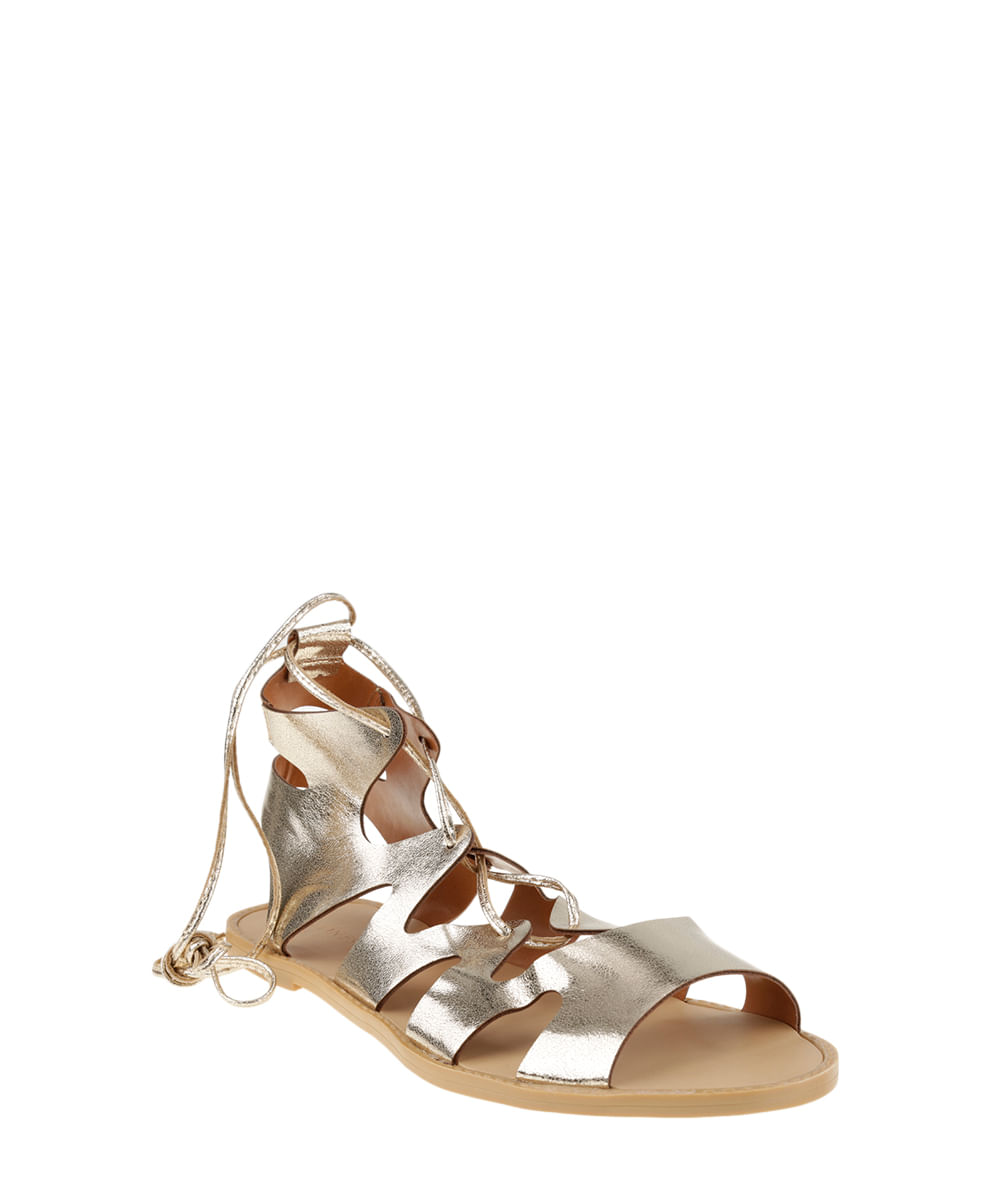A rasteirinha tem detalhe de cabedal com efeito metalizado com recortes de formato ondulado. O fechamento é por amarração no tornozelo e o solado é emborrachado.