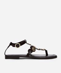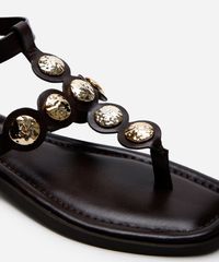 • Cabedal no estilo T-strap com suporte para o dedo e aplicação de tachas redondas texturizadas.