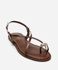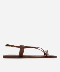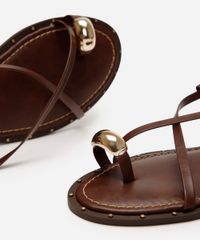 Rasteirinha feminina desenvolvida em material sintético. O modelo tem bico redondo, cabedal com tiras finas cruzadas, detalhe de aviamentos com banho dourado, fechamento por fivela com níveis para ajuste no calcanhar, parte interna com palmilha acolchoada, solado emborrachado e macio. Sola com textura que facilita o caminhar.