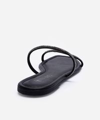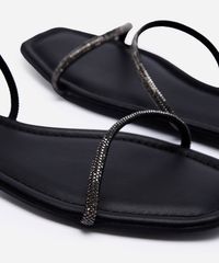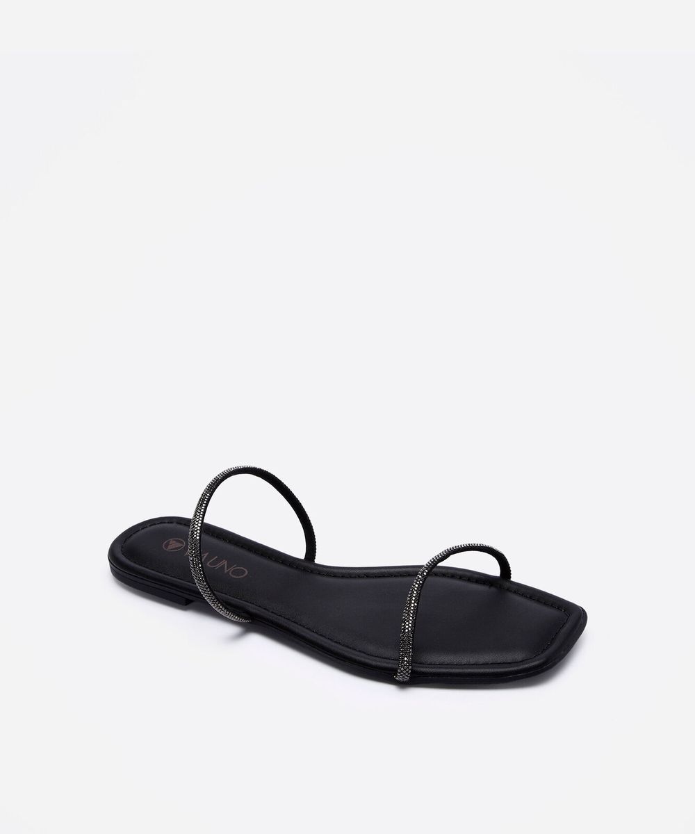 Rasteirinha feminina desenvolvida em material sintético resistente. O modelo tem bico quadrado, cabedal de duas tiras finas com strass aplicado. Possui solado com leve acolchoado com inscrição de marca e sola texturizada emborrachada que auxilia no caminhar.