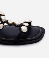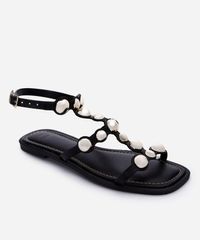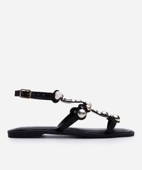 Rasteirinha gladiadora feminina desenvolvida em material sintético resistente. O modelo tem bico quadrado, cabedal com tiras, tachas aplicadas e fechamento lateral com fivela e níveis de ajuste. Possui solado pespontado com inscrição de marca e sola texturizada.
