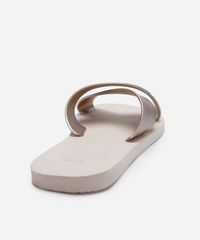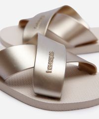 Rasteirinha feminina desenvolvida em material emborrachado resistente. O modelo tem bico redondo e cabedal com tiras largas cruzadas. Possui solado macio com e sola texturizada que auxilia no caminhar.