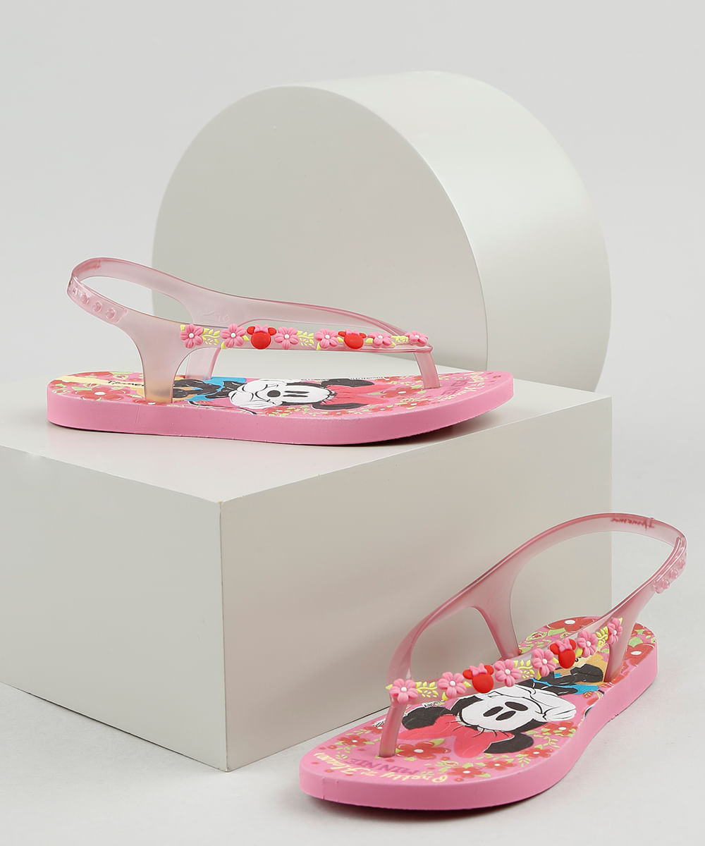 Rasteirinha infantil feminina desenvolvida em material emborrachado maleável. O modelo Disney Joy tem tema da personagem Minnie Mouse com flores. O cabedal de dedo é transparente com aplicação temática e fechamento lateral com níveis de ajuste.