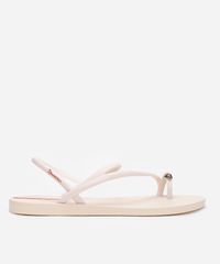 Rasteirinha feminina Ipanema Glam desenvolvida em material emborrachado resistente. O modelo tem bico redondo, cabedal com tiras finas cruzadas com suporte para encaixar os dedos e aviamento com efeito metalizado. Possui solado macio e sola texturizada que auxilia no caminhar.
