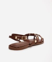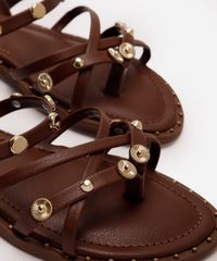 Rasteirinha feminina confeccionada em material sintético resistente. O modelo tem bico quadrado, cabedal com tiras finas cruzadas com tachas aplicadas, suporte para encaixar os dedos e fivela posterior com níveis de ajuste. Possui solado com leve enchimento e inscrição de marca e a sola é texturizada e auxilia no caminhar.