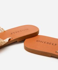 • Cabedal formado por tiras largas e cruzadas com textura tramada, que remete à ráfia.
