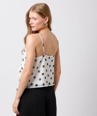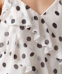 Regata feminina confeccionada em tecido plano texturizado com estampa poá. A peça tem modelagem reta e caimento solto ao corpo com babados aplicados na parte frontal. O modelo tem decote V, alças finas ajustáveis e forro em malha.