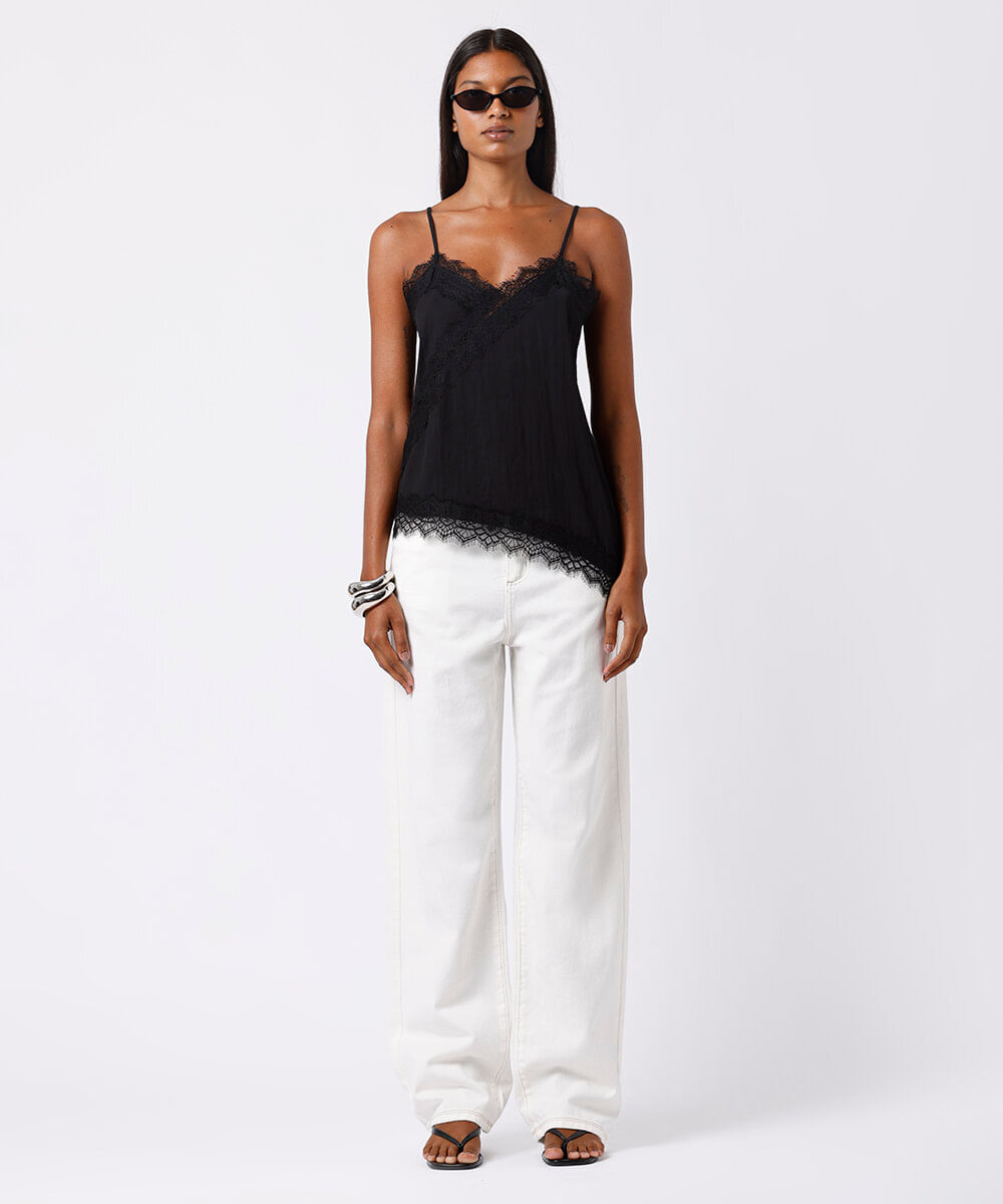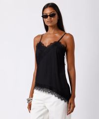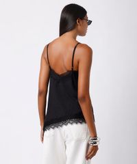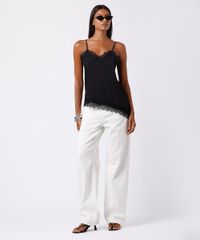 Regata feminina confeccionada em tecido plano com toque acetinado e detalhes em renda. A peça tem modelagem reta e caimento solto ao corpo. Possui decote frente v e alças finas ajustáveis. Detalhe de acabamento com assimetria na barra.