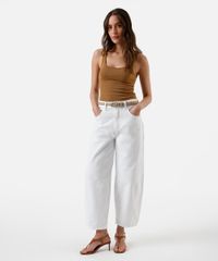 Regata feminina confeccionada em malha de algodão. A peça tem modelagem reta e caimento ajustado ao corpo. O modelo tem decote quadrado e alças largas. Detalhe de acabamento em viés nas cavas e pesponto na barra.