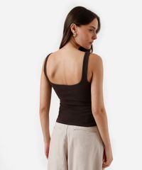 Regata feminina confeccionada em malha de algodão. A peça tem modelagem reta e caimento ajustado ao corpo. O modelo tem decote quadrado e alças largas. Detalhe de acabamento em viés nas cavas e pesponto na barra.