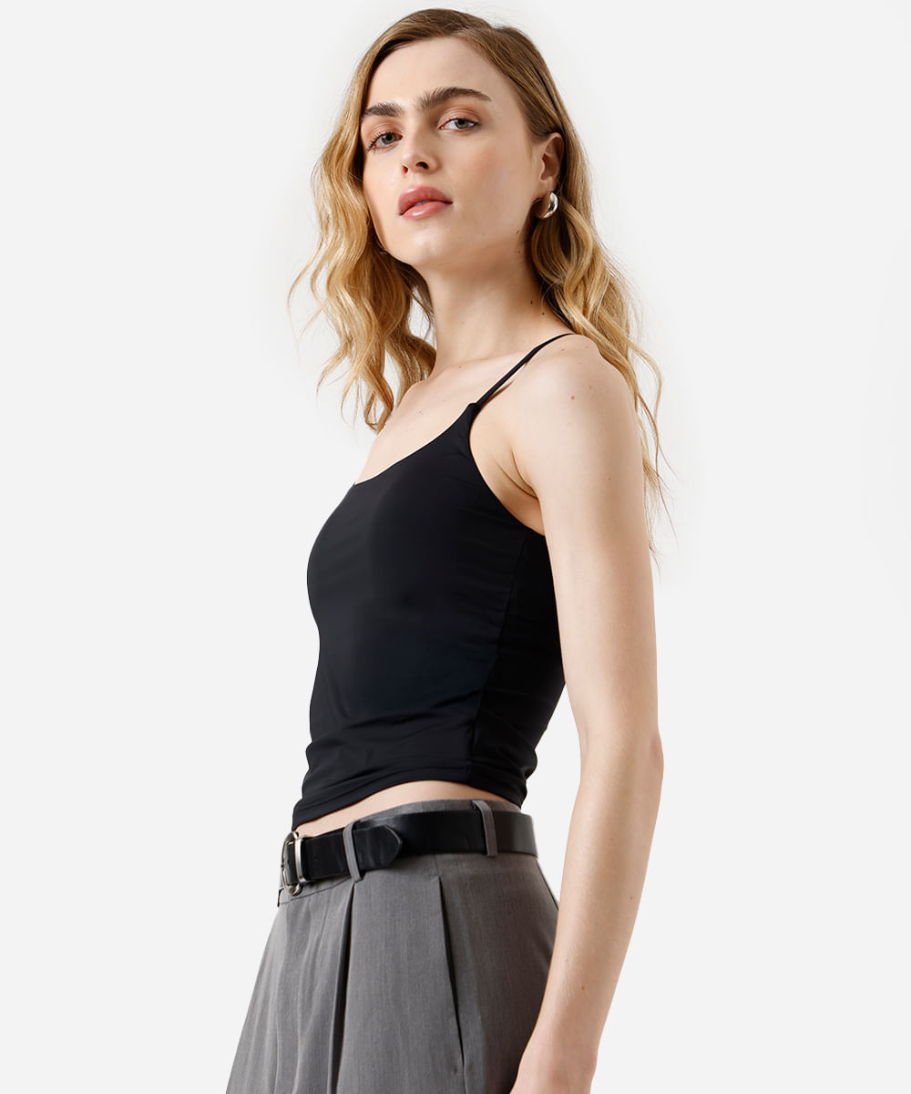 Regata feminina confeccionada em malha de poliamida. A peça tem modelagem reta e caimento ajustado ao corpo. O modelo tem decote quadrado e alças finas elásticas. Possui bojos removíveis e acabamento pespontado na barra.